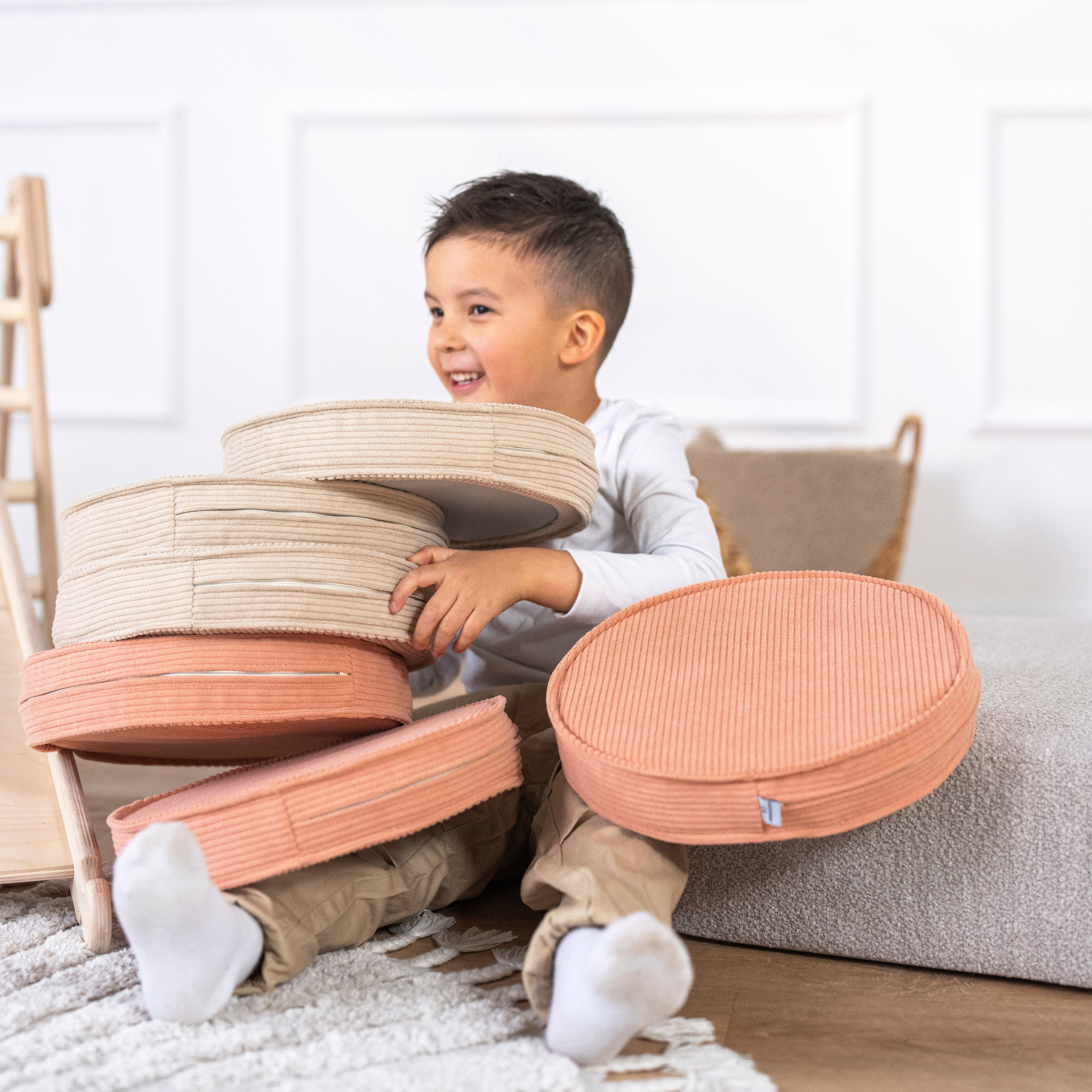 Die weichen Hüpfsteine aus Schaumstoff mit Cordbezug fördern spielerisch Bewegung, Gleichgewicht und Kreativität. Ideal für drinnen – zum Hüpfen, Balancieren und Stapeln. In vielen Farben und Sets.