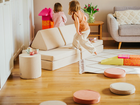 Mit dem Spielsofa und den Loopis entdecken Kinder spielerisch ihre motorischen Fähigkeiten. Klettern, balancieren und bauen stärkt Gleichgewicht, Koordination und Selbstvertrauen ganz nebenbei im freien Spiel.